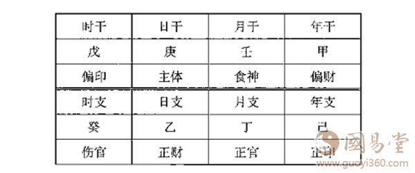作者认为,“时”是“日”的一部分是“日所生”。日干为庚宫,时支则为癸宫。跟_上面相仿的理由,时千为戊宫。由它们跟日干的关系,推出时干成为偏印宫,可代表师长、继母、家教心等;时支癸为伤官官,可代表儿子(女性而言)、晚辈、名声、谈吐、文艺才能等。