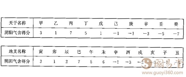 表中一代表“阳”,一一代表“阴",O代表“太极”。接着,作者自创了一套“阴阳记分法”圆,列出天干和地支的“阴阳气含”得分如下: