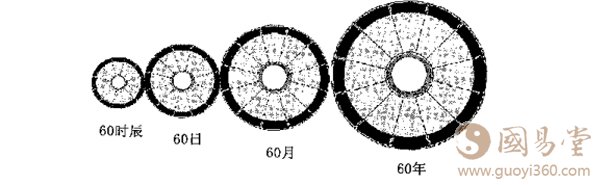 再来看干支符号模型。它有十个天干、十二个地支,共二十二个符号。通过这二十二个符号相互组合,产生了六十甲子的干支组合集。值得注意,这些符号都已蕴含了阴阳五行的信息。因此,运用这六十甲子,在年段层次上,它可以表现以六十年为一个循环周期的阴阳五行消长变化的节律;在月段层次上,它可以表现以六十个月(即五年)为一个循环周期的阴阳五行变化的节律;在日段层次上,它可以表现以六十天为一个循环周期的阴阳五行变化的节律;在时辰段的层次,上,它又可以表现以六十个时辰(即五日)为一个循环周期的阴阳五行变化的节律。如果把六十甲子看作一个时间的车轮,那么,把四个这样的车轮组合起来,就能表现出跨度为六十年的年、月、日、时辰不同层次上的周期性的变化:
