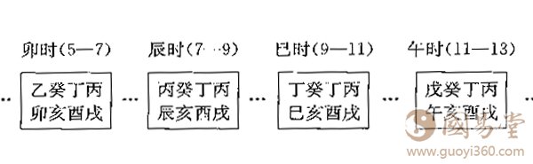 显然,若以一个时辰为一个时间片断单位,则每-一个这样的单位都可以有一个与之相对应的四柱(或八字)符号结构。例如,2006年10月1日(农历八月初十),即为丙戌年、丁酉月、癸亥日。再进一步,从早晨五点开始,接连相续的四个时辰则为:乙卯、丙辰、丁巳、戊午。于是,这四个连续的时间片断,可以图示如下: